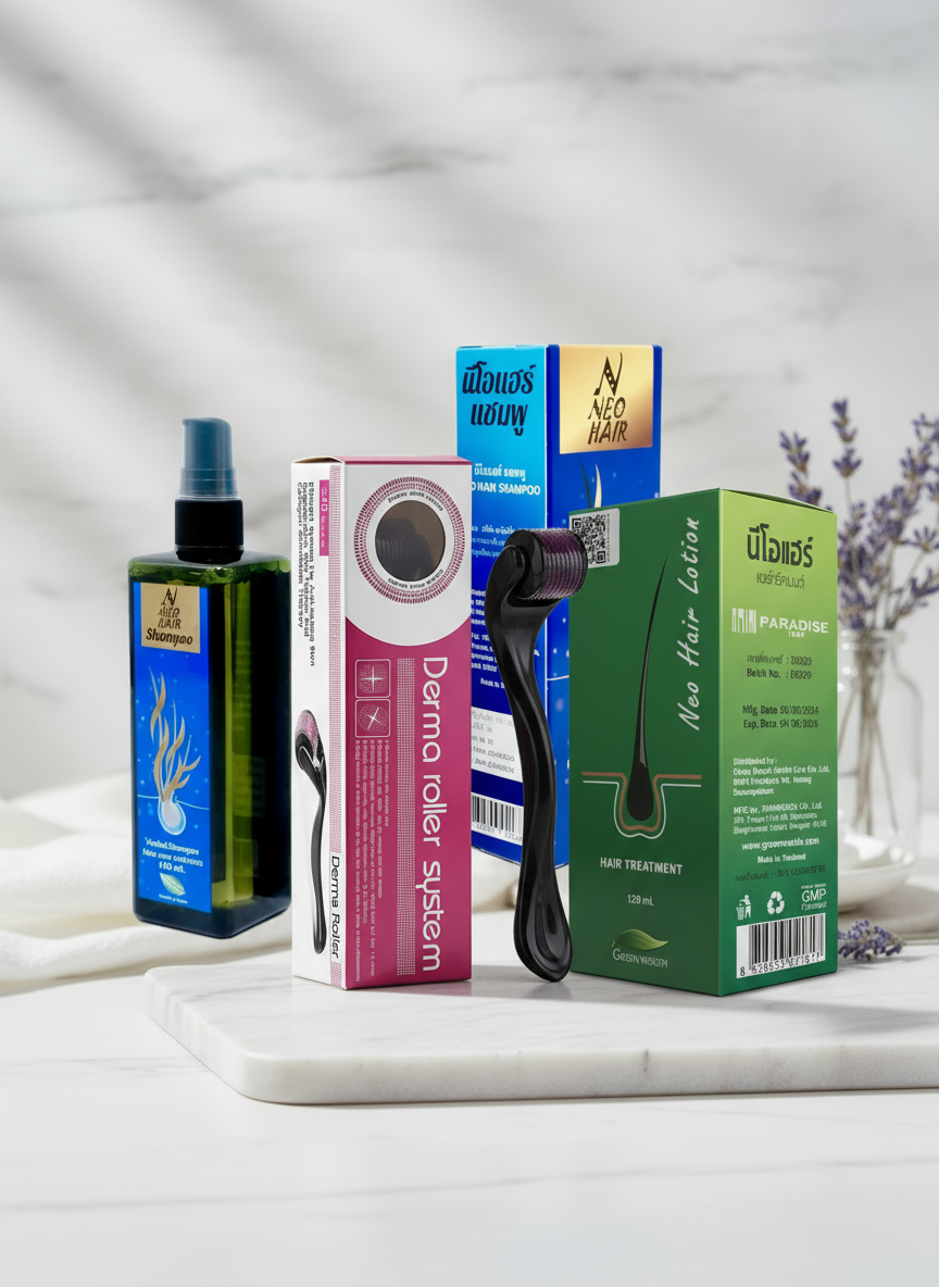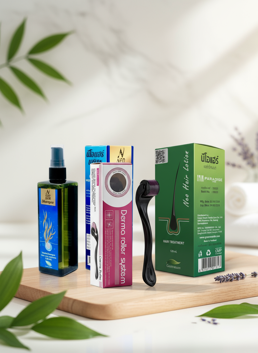 Achieve stronger, thicker, and naturally healthy hair with the Neo Hair Complete Growth Set — featuring Neo Hair Lotion, Neo Hair Shampoo, Herbal Hair Oil, and a Derma Roller.